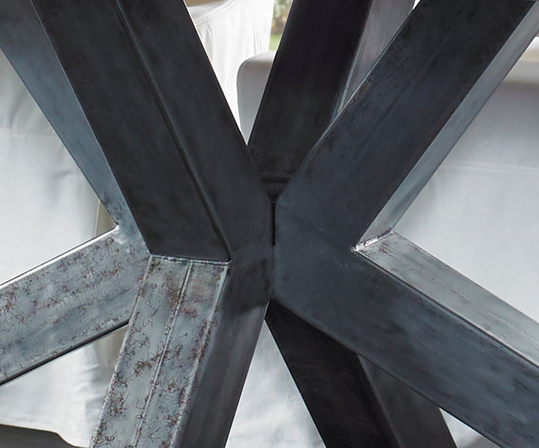 Our Arena Reclaimed Teak Dining Table features striking spider like architectural legs in industrial metal and a gorgeous, reclaimed teak wood top. The neutral colors of the Reclaimed Teak top help to make it a versatile table that easily melds with other styles. This table is part of our New Eco Industrial Chic look which combines cold industrial metal with the warmth of our reclaimed teak wood. While this wood features many color variations, the top remains very smooth to the touch. All of the unique markings, crevasses, fractures and color variations demonstrate the rich history this wood has. Having stood the test of time and weathered many storms, this wood has proven its durability.