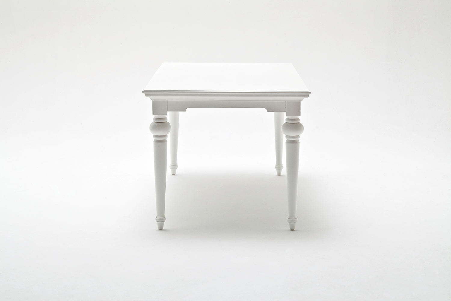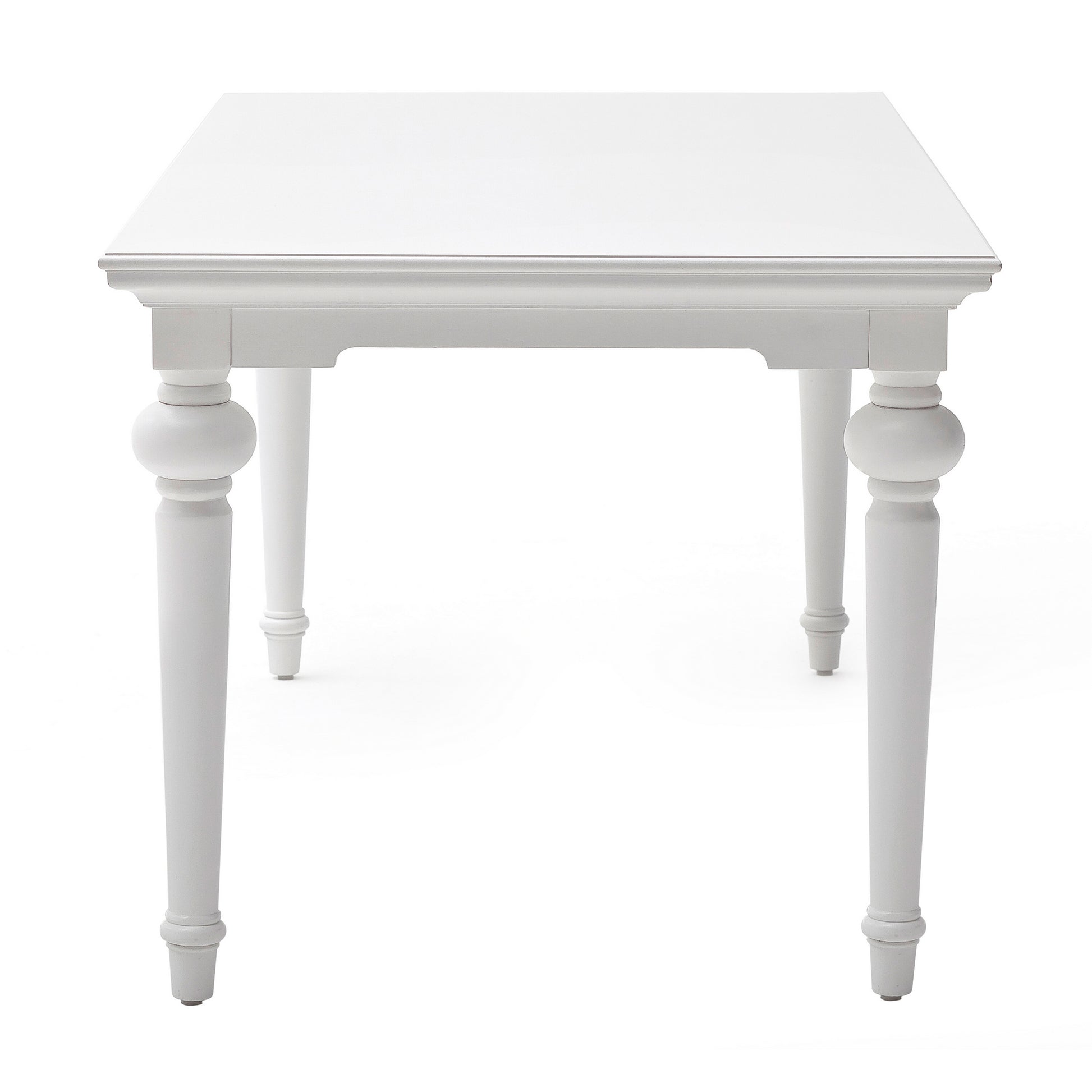 The bright tone and glossy finish of this table will help to make a small room feel larger. Beneath the sleek white top, lies four trumpet-turned legs that are tapered towards the bottom to make the table feel slender and sophisticated.